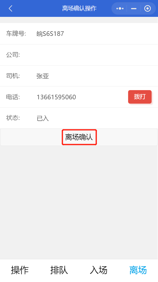 ▲作业结束后门岗得到放行指令,门岗小程序一键点击离场