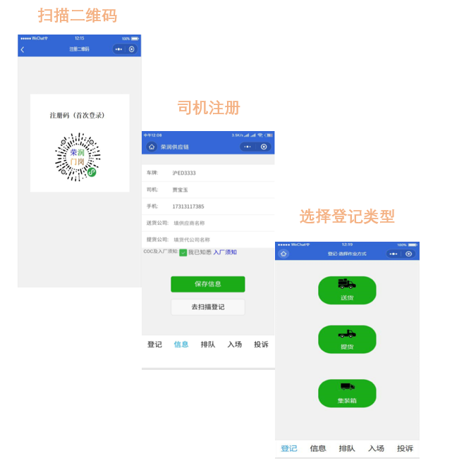 ▲司机点击登记--选择登记类型(提货、送货、集装箱)